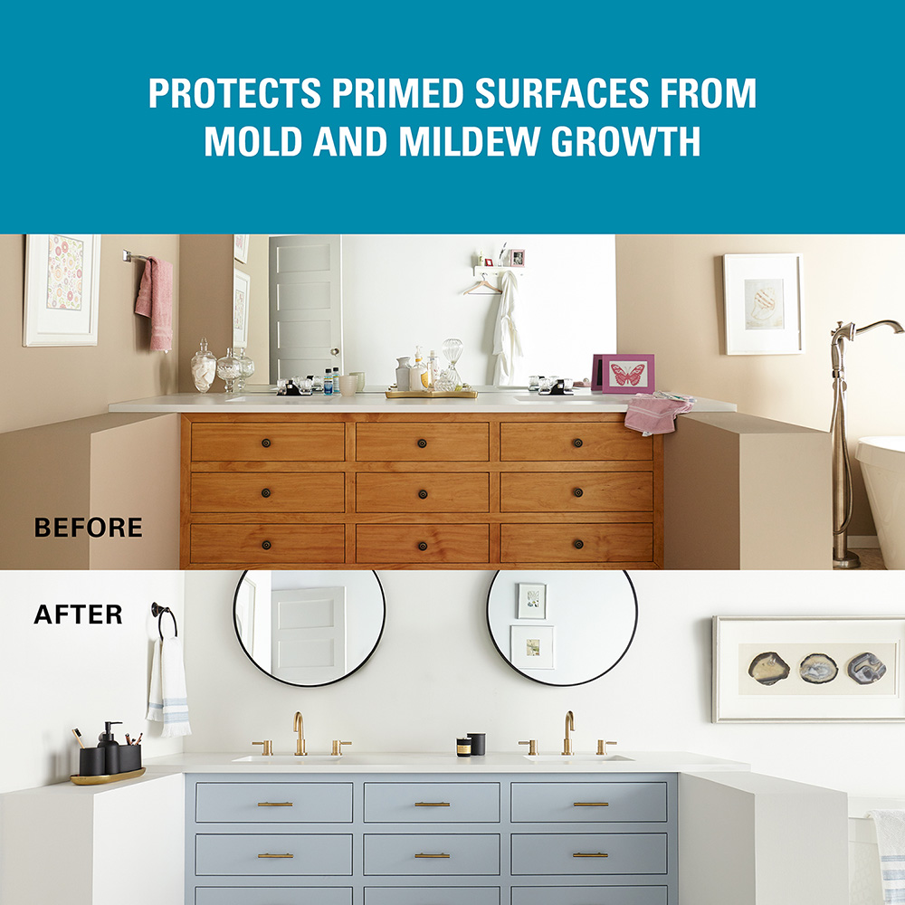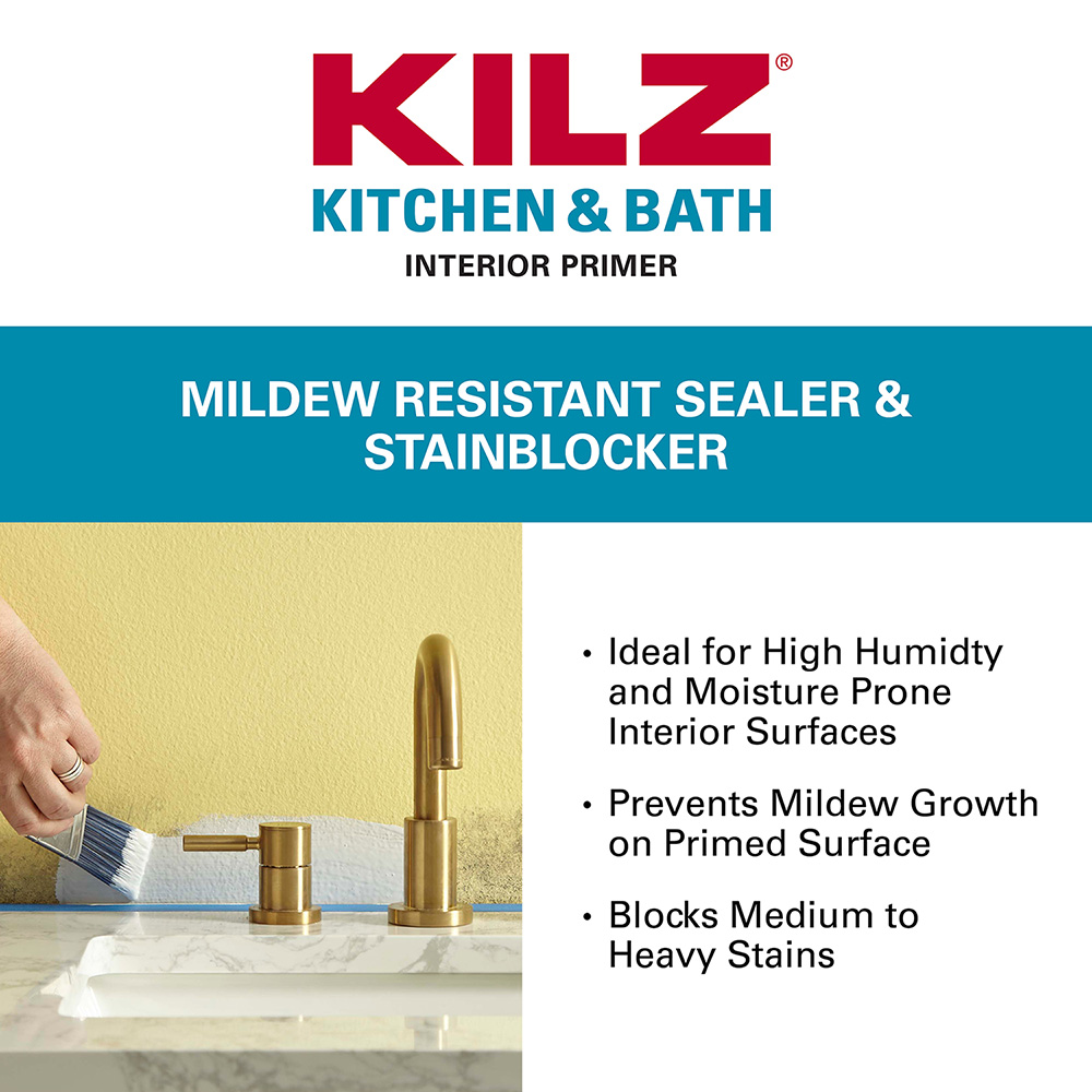 KILZ® KITCHEN & BATH Primer is a water-based primer-sealer-stainblocker that is specially designed for residential surfaces in high humidity, moisture and temperature environments such as kitchens, bathrooms, powder rooms and laundry rooms. It offers excellent adhesion to most interior surfaces and provides a sound anchor for paints.
