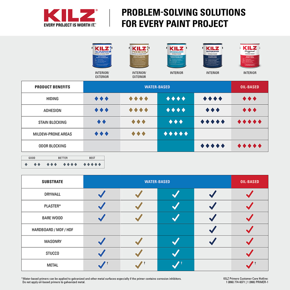 • Fire Restoration: Not recommended. Primer Recommendations: oil based primers such as KILZ® ORIGINAL and KILZ® ORIGINAL EXTERIOR or water based primers such as KILZ® RESTORATION.