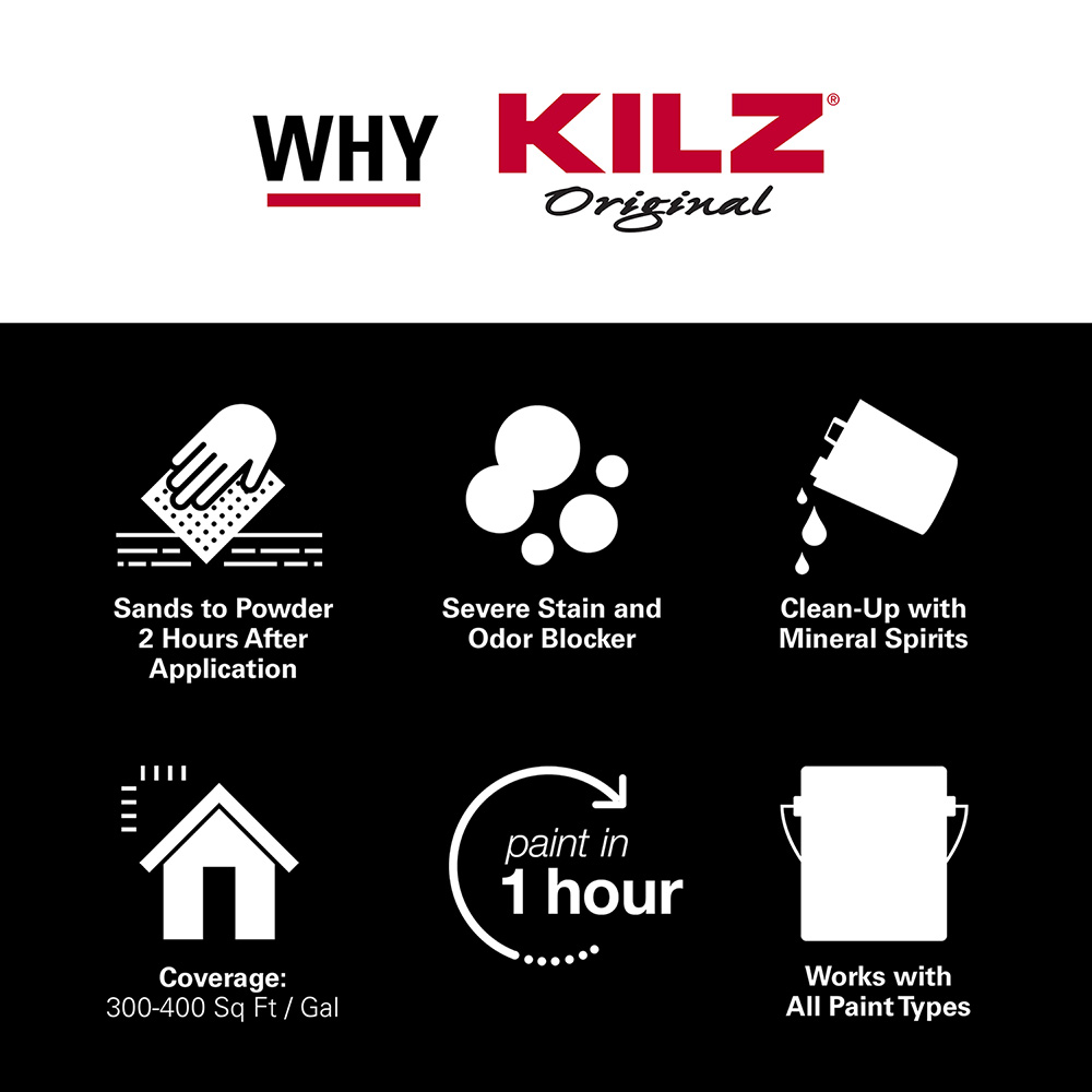 KILZ® ORIGINAL has been a trusted brand for over 40 years! This interior and exterior primer is specially formulated to be a sound undercoat for paint and will help enhance the topcoat’s performance. It has excellent adhesion to both interior and exterior surfaces including masonry, metal and excellent penetration for bare wood.