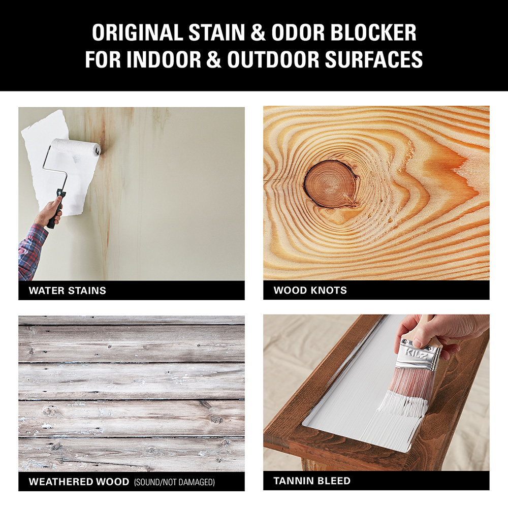KILZ® ORIGINAL INTERIOR/EXTERIOR is a fast drying oil-based sealer that blocks most severe stains including tannin bleed, graffiti, smoke, fire and water stains as well as sealing pet, smoke and food odors. Use on interior and exterior surfaces including wood, drywall, plaster, brick, masonry, stucco, interior siding and paneling, metal and properly prepared glossy surfaces†. Not recommended for floors.