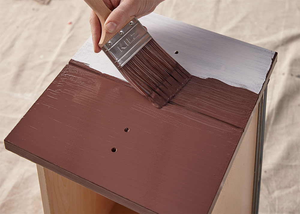 Step 5: Once primer is dry, apply KILZ® Tribute® paint in Bookmarker with a brush, moving in smooth strokes in the same direction as the wood grain.