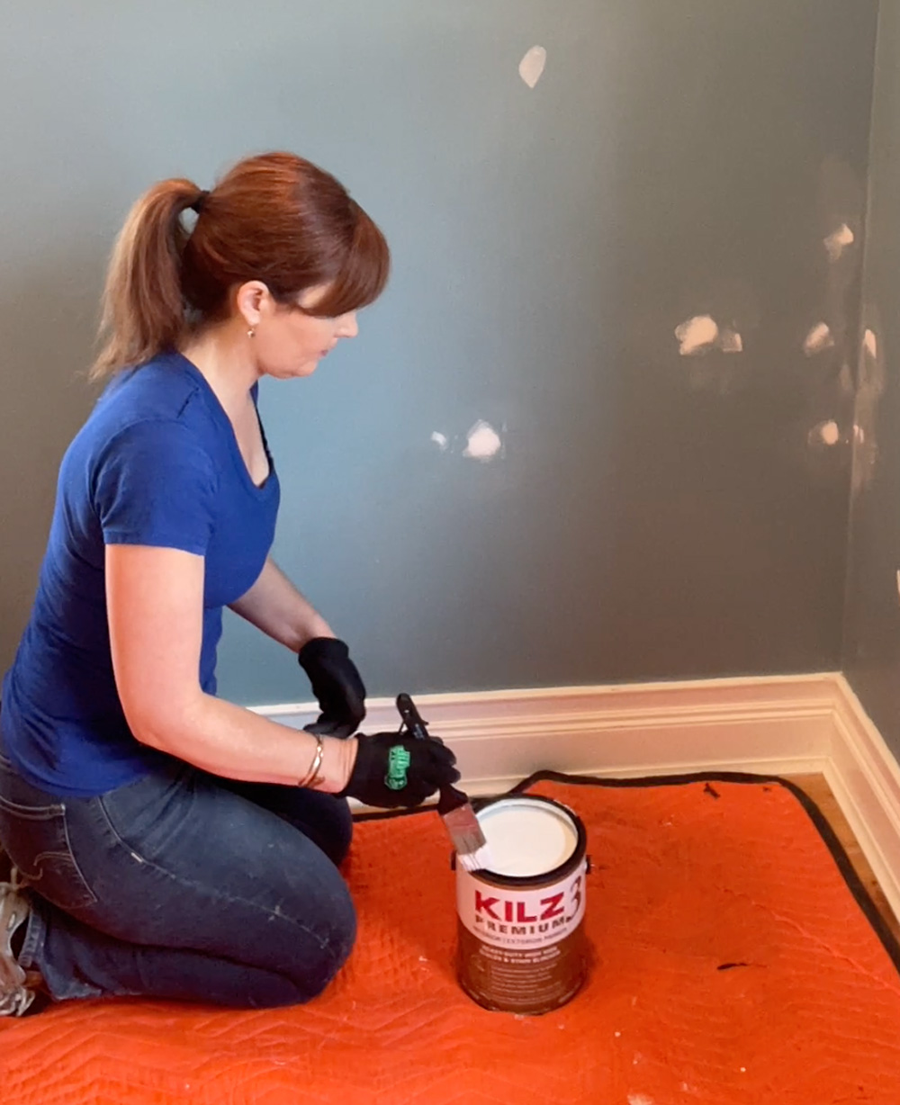 For this project, we chose KILZ 3® PREMIUM Primer because it’s fast drying, low odor, very low VOC, and it has excellent adhesion. The thicker formula also hides surface imperfections, which is ideal for this house that was built in 1903 and has a lot of ‘character’ marks from the previous owner and our busy family.