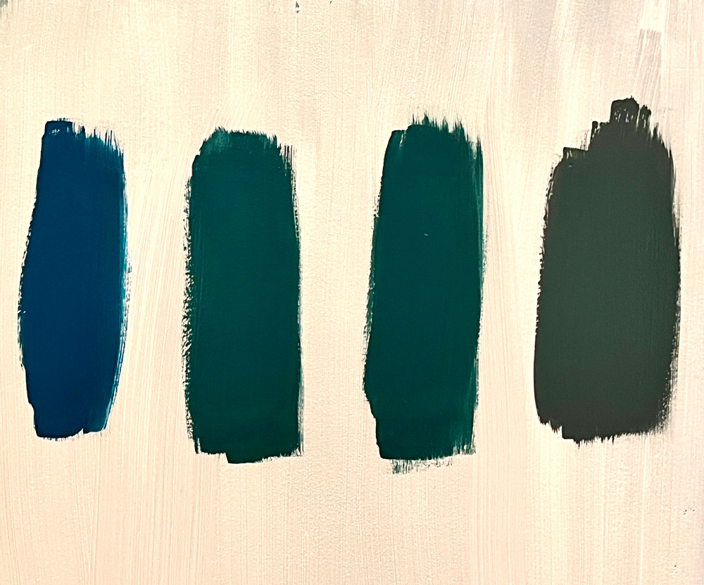 For this project, I chose four colors and asked my husband Mark to pick his favorite. He chose Secondhand Find from Magnolia Home by Joanna Gaines® by KILZ (the color on the right), which is a rich and very saturated bluish-green. An excellent modern color that fits with our goal of a calm and sophisticated vibe.