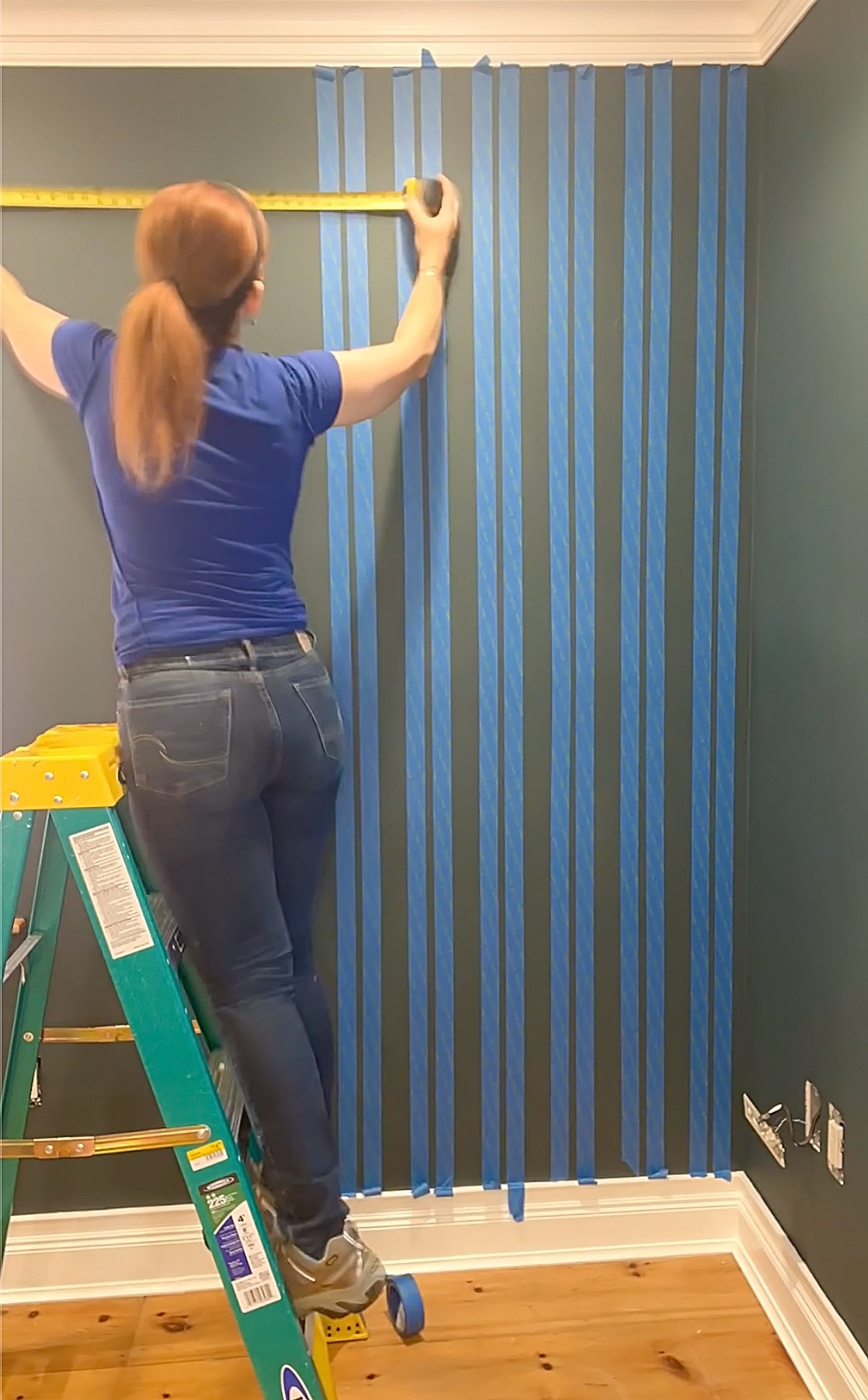 After marking the layout of each stripe with a tape measure, level, and pencil at the top, middle, and bottom of the wall, I extended the painter’s tape from the top of the wall to the bottom. For a stripe to work, it needs to look vertical and consistent. So, after each set of stripes, I checked for plumb and measured the distance between the stripes to be sure I was on the mark.