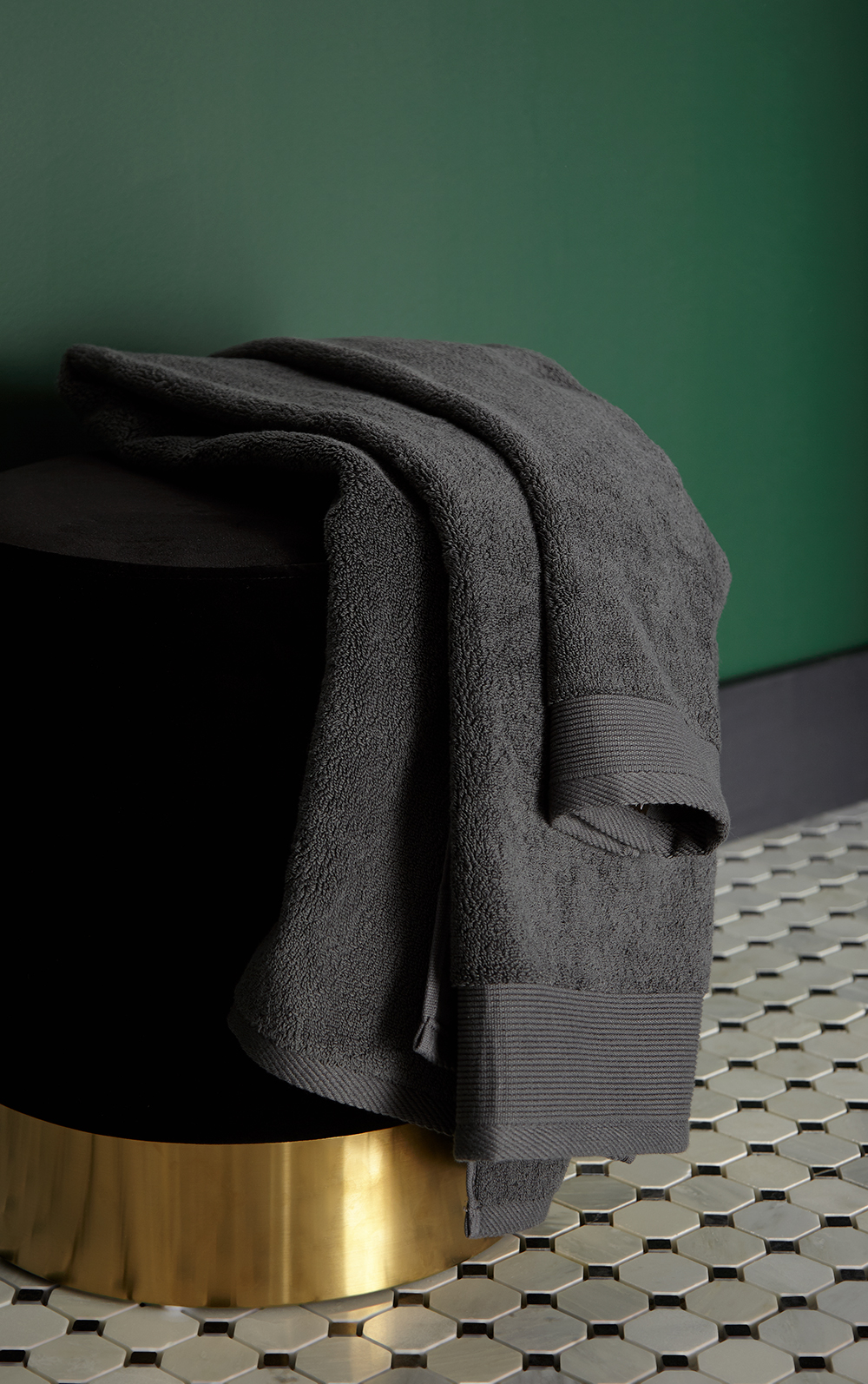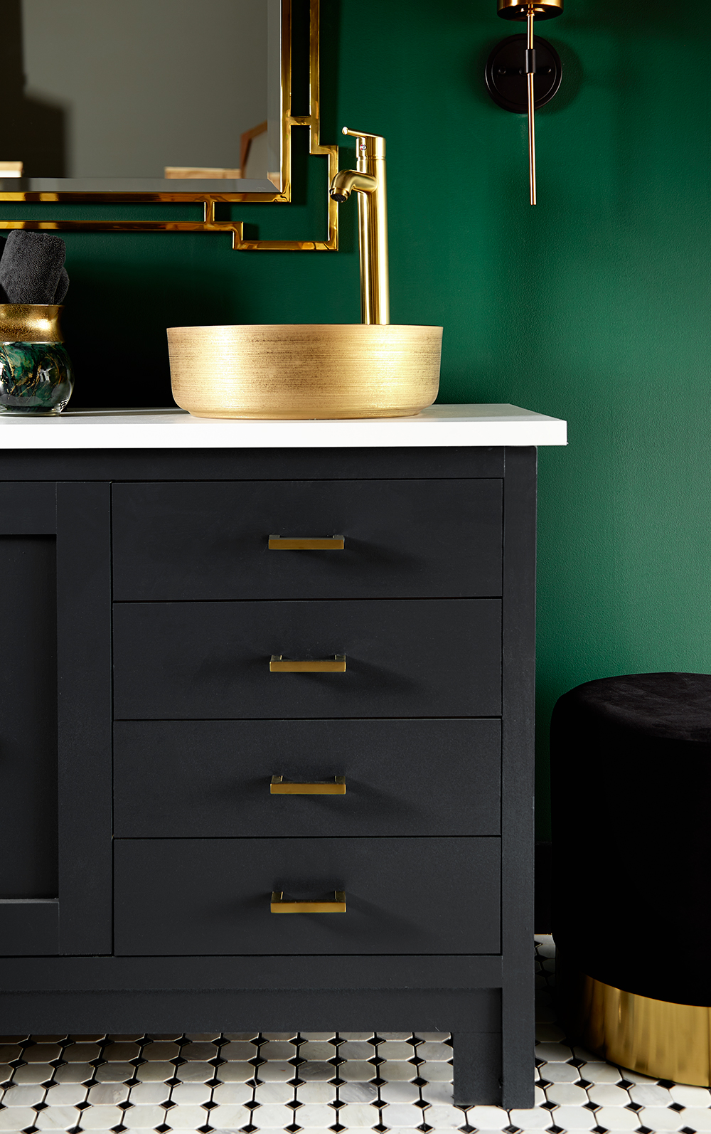 Once the walls were properly primed with KILZ® Mold & Mildew and allowed to dry, it was time to paint. A deep emerald green was the perfect paint color for the walls and complemented the new black vanity. Brushed gold sinks, black and white tile and an oversized art deco-inspired mirror added sophistication to the space and completed the master bathroom transformation.
