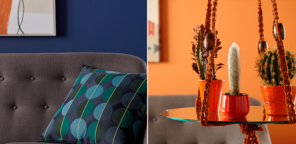Keeping the same major pieces of furniture for both looks (including the sofa, coffee table and arm chair), the paint color alone made a big difference in the feel of the space. Pillows, plants and other small décor items in a range of blue shades brought in a modern yet minimalist look, while a hint of bright orange in the artwork alluded to the next color that would transform the room.