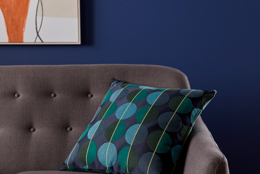 If you read our recent post on 2020 Design Trends, you know that we’re loving all shades of navy blue. The moody color works great in many different room types, and it was the perfect hue to bring some cool drama into this large living room. We chose KILZ Tribute® in Ruling Royalty – a dark blue with a subtle purple undertone that appears as a true navy in most light. KILZ Tribute is a high-quality, water-based paint that provides a durable and scrubbale finish that is ideal for high traffic areas like living rooms.