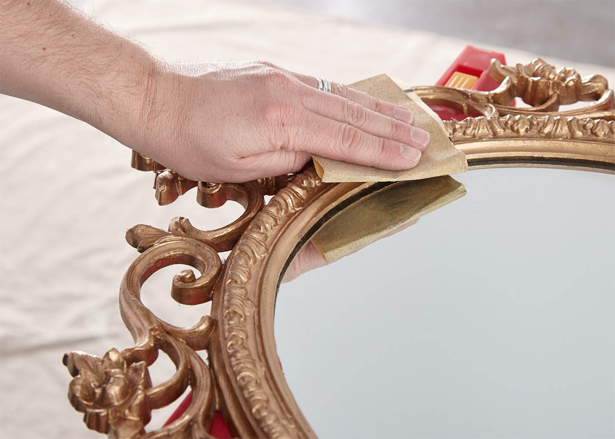 Step 1: Sand the mirror frame, first with 100-150 grit sandpaper and then finish with a second pass of 180-220 grit sandpaper.