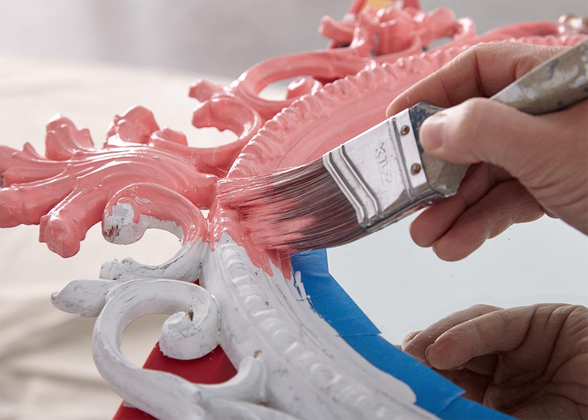 Proper priming also provides a solid anchor for paints – in this case a deep purple wall and coral-hued bath vanity. A painted “wall paper” accent wall and pink mirror complete the space. For this bathroom makeover, BEHR Premium Plus® in Watermelon Punch, KILZ Tribute® in Spanish Fortress and Beetroot Purple were used as accent colors over a white wall to create the fun faux wallpaper. Beetroot Purple was also used for the dramatic dark wall behind the vanity, with Watermelon Punch coating the vanity and matching mirror.