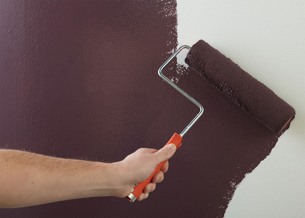 Step 4: Once primer is dry, apply KILZ Tribute in Beetroot Purple using the same application method as the primer (using a brush first to cut in around the edges 4 to 6 feet at a time, then use a roller to fill in those sections before moving along).