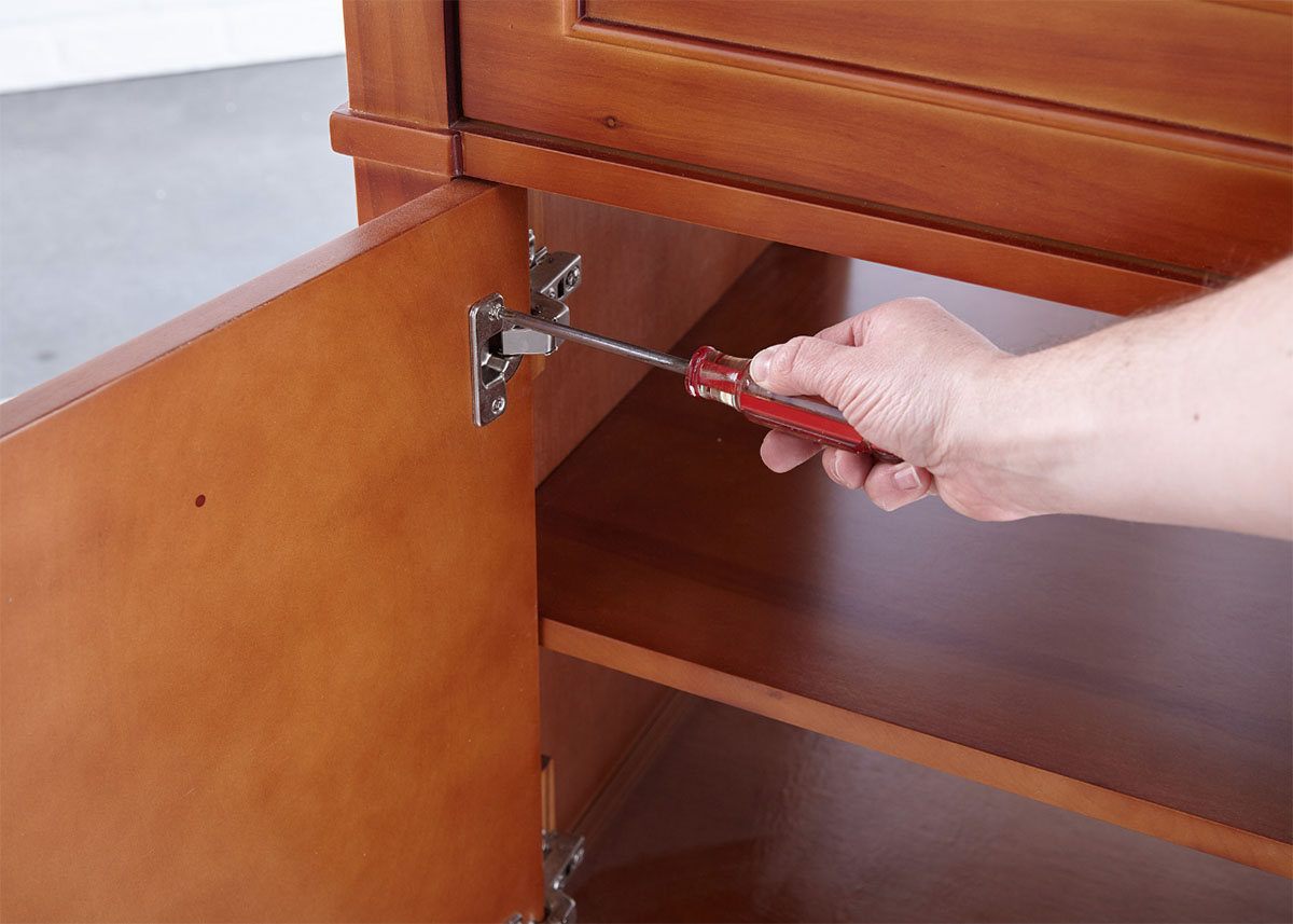 Step 1: Remove drawers and hardware. Put the screws back into the hardware, then seal the hardware and screws in painter’s tape and label it. It’s always best to put every screw back exactly where it came from. That will put the least amount of stress on the wood.