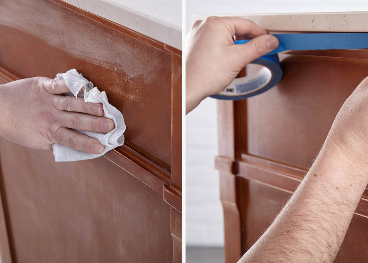 Step 3: After sanding, wipe down the surface with a damp cloth to remove any dust or residue and allow the surface to dry. Once dry, apply painter’s tape around the countertop edges.