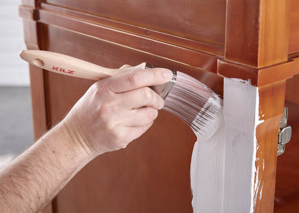Step 4: Apply KILZ Kitchen & Bath (stirring thoroughly before and occasionally during use), moving in the same direction as the wood grain for best results. Allow primer to dry for 1 hour.