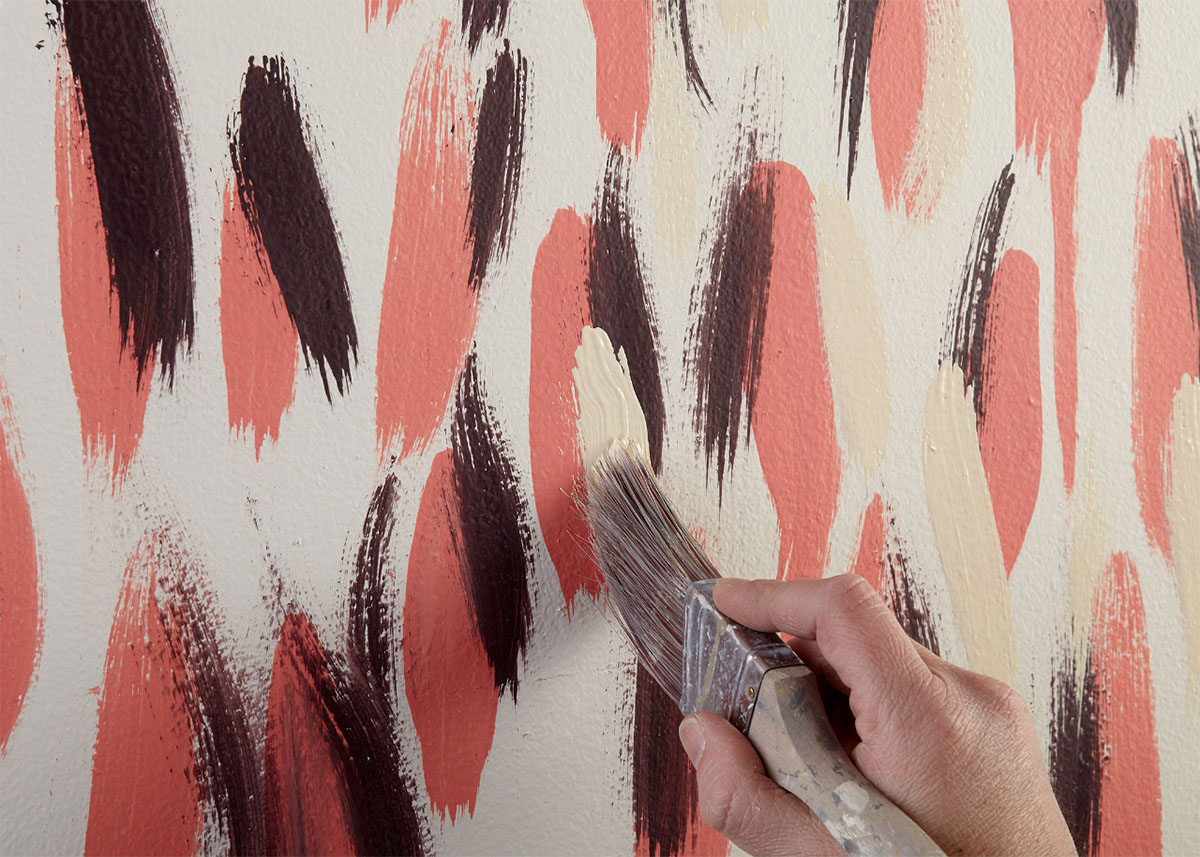 Step 2: Starting with BEHR Premium Plus in Watermelon Punch, use a brush and apply vertical strokes across entire wall. Once dry, use KILZ Tribute in Beetroot Purple and repeat, slightly overlaying the vertical strokes across the first pink strokes. Allow to dry and repeat with KILZ Tribute in Spanish Fortress.