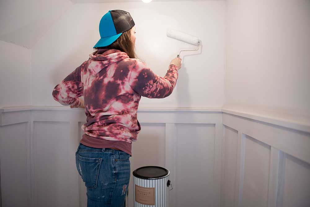 The primers both dried very quickly and allowed me to get to painting in just over an hour from when I applied the primer! It was incredibly helpful to be able to start AND finish priming and painting this room in a single day. I made sure to roll on the True White paint on the drywall first so that any accidental splatters would land on a primed bench below rather than a freshly painted one. If you don’t know this trick yet, you can always stick your roller in a bag or wrap it in foil and then put it in your refrigerator to keep the paint from drying if you need to take a short break.