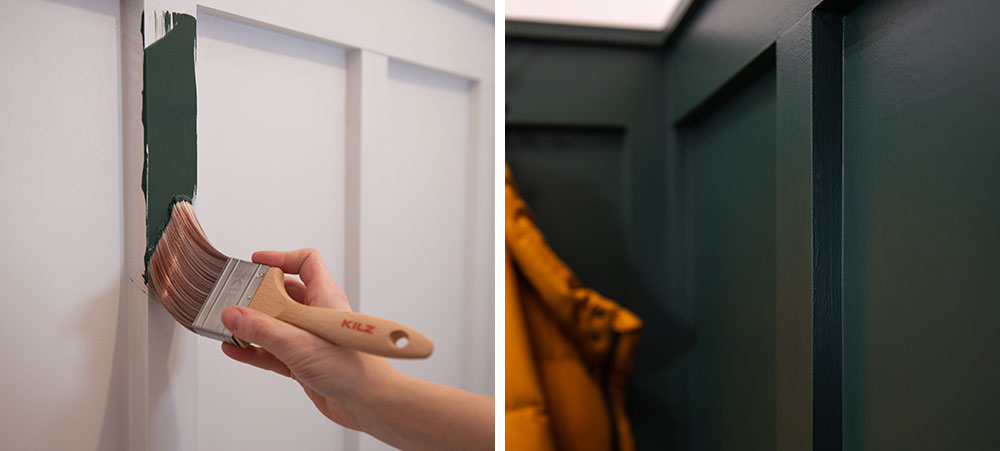 After the drywall got its first coat on, I grabbed KILZ 3® Premium primer and went to work beginning to prime the face frame of the new bench. A great primer like KILZ 3 Premium can make your DIY project a successful one, especially if you are using a knotty wood like pine. Knots in pine can release resins over time that can actually penetrate a layer of paint and leave you with an unattractive yellowish stain if you don’t use a sealing primer like KILZ to lay a proper foundation for your paint.