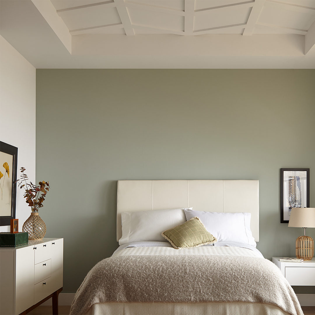We tapped into three different bedroom paint color palettes for the accent walls, the first being calming blue hues. Our inspiration for the first accent wall was a beautiful, misty mountain range. We used KILZ Tribute® Paint and layered lighter to deeper blues to create a stunning mountain-inspired mural. The colors chosen were Alaskan Mist TB-03, Sea Balm TB-43, Chambray Blue TB-45 and Behr’s Laguna Blue PPU14-18 and were painted by hand in an organic mountain shape. Light blue bedding, pops of metallic and faux fur perfectly complement the calming misty mountain accent wall.