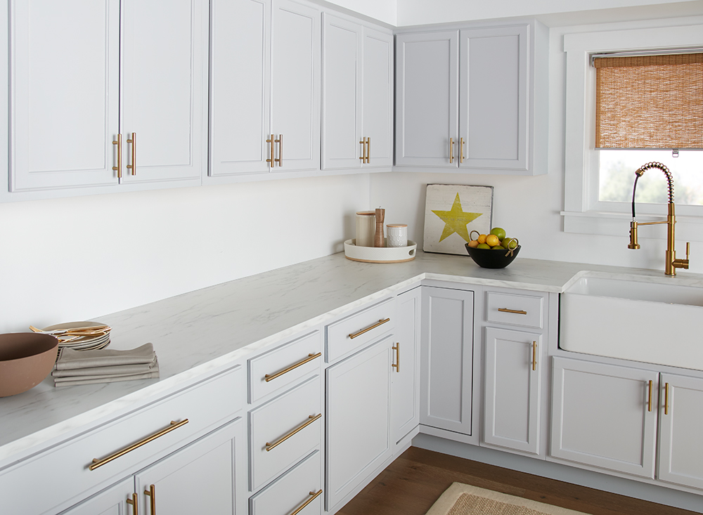 One thing the professionals know is that priming your cabinets prior to painting can make all the difference in how the final paint job appears – and how long it will last. When choosing the right primer for your kitchen, it’s important to look for a product that offers exceptional durability and mildew resistance. KILZ 3® Premium is a heavy-duty water-based primer that offers excellent adhesion, superior durability and provides a mildew resistant coating – ideal for moisture-prone areas like kitchens. After properly preparing the cabinets, including sanding and priming with KILZ 3 Premium, it was time to paint! To breath some lightness into these dark and heavy cabinets, we chose KILZ® Tribute in Brushed Metal – a cool silver with hints of blue and violet. The new airy and soothing paint color was complemented with brushed gold hardware, new white countertops and an all-white backsplash. For step-by-step kitchen cabinet priming and painting instructions, check out our post on a Colorful Kitchen Cabinet Transformation.