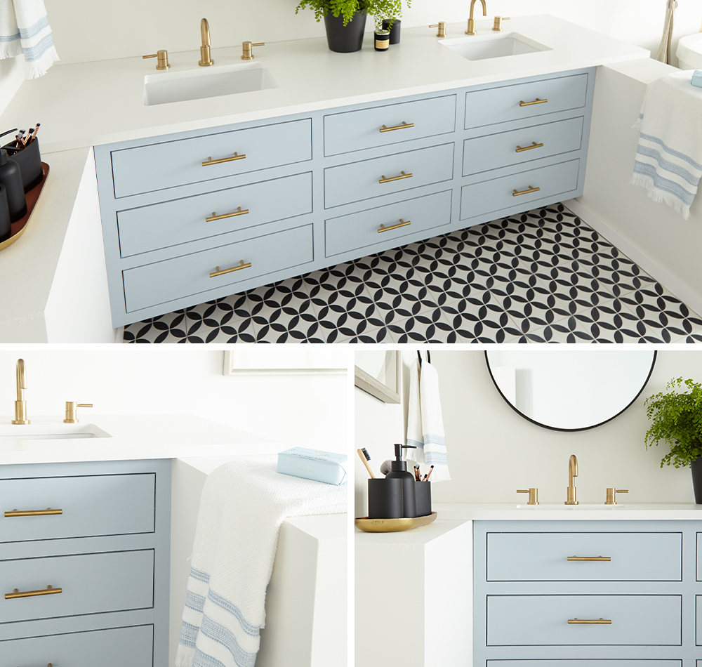 The light and bright bathroom makeover brings in a touch of contemporary flair with new brushed gold hardware and sleek circular mirrors topped with gold, globe-shaped light fixtures. And for the finishing touch, black and white tile flooring perfectly complements the new color scheme without competing – letting the beautiful blue vanity shine as the room’s focal point.