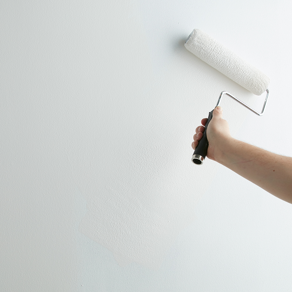 Once primer is dry, apply KILZ Tribute® in White Modern using the same application method as the primer (using a brush first to cut in around the edges 4 to 6 feet at a time, then use a roller to fill in those sections before moving along).