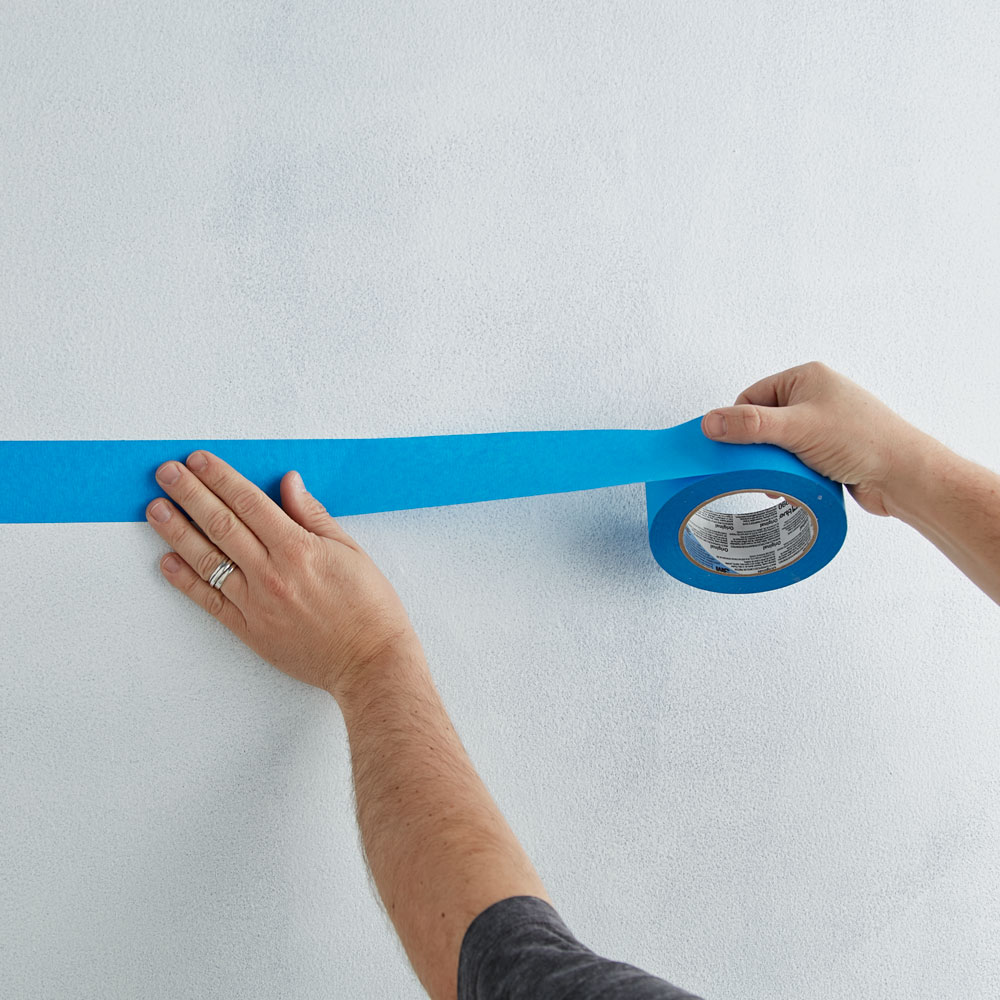 Once primer is dry, it’s time to tape off the color black pattern. Mark the wall where you want the top lighter color and darker bottom color to hit. Using a level and a pencil, draw a thin line to guide you. Next, apply painter’s tape to the line.