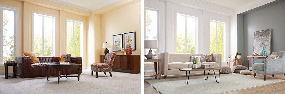 As you can see in the “before” photo, nothing looks duller than a bland expanse of carpet, so it was an easy choice to replace it with luxurious gray hardwood flooring, topped with a plush cream-colored rug quilted in an attractive diamond pattern.