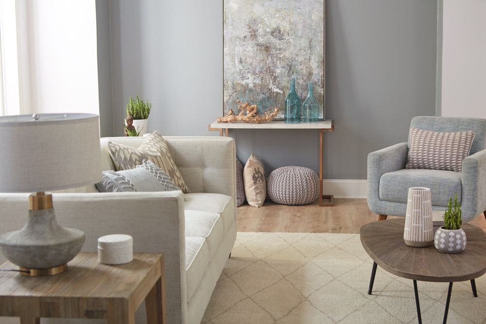 We accessorized with a couple of wood accent tables, including an attractive console table that we used to support a stunning modern painting that reflects both of the room’s primary colors. We upped the comfort level several notches by adding overstuffed pillows in complementary shades.
