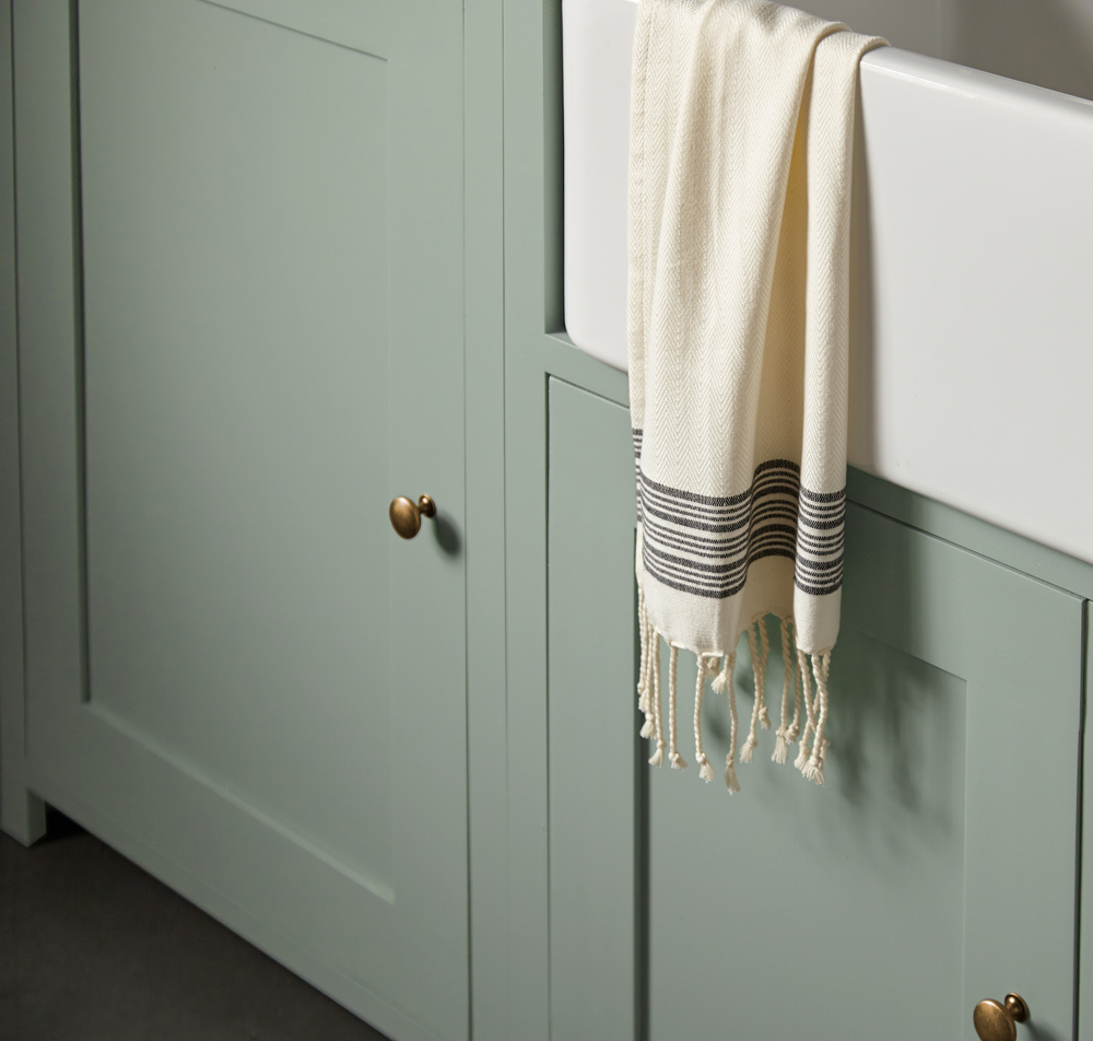 Once your primer is dry, apply Magnolia Home by Joanna Gaines Trim & Cabinetry Interior Semi-Gloss Paint in Silos District to the lower cabinets and True White to the upper cabinets. Apply the paint with a brush, moving in smooth strokes in the same direction as the wood grain. Remove the painter’s tape before the paint is fully dry.