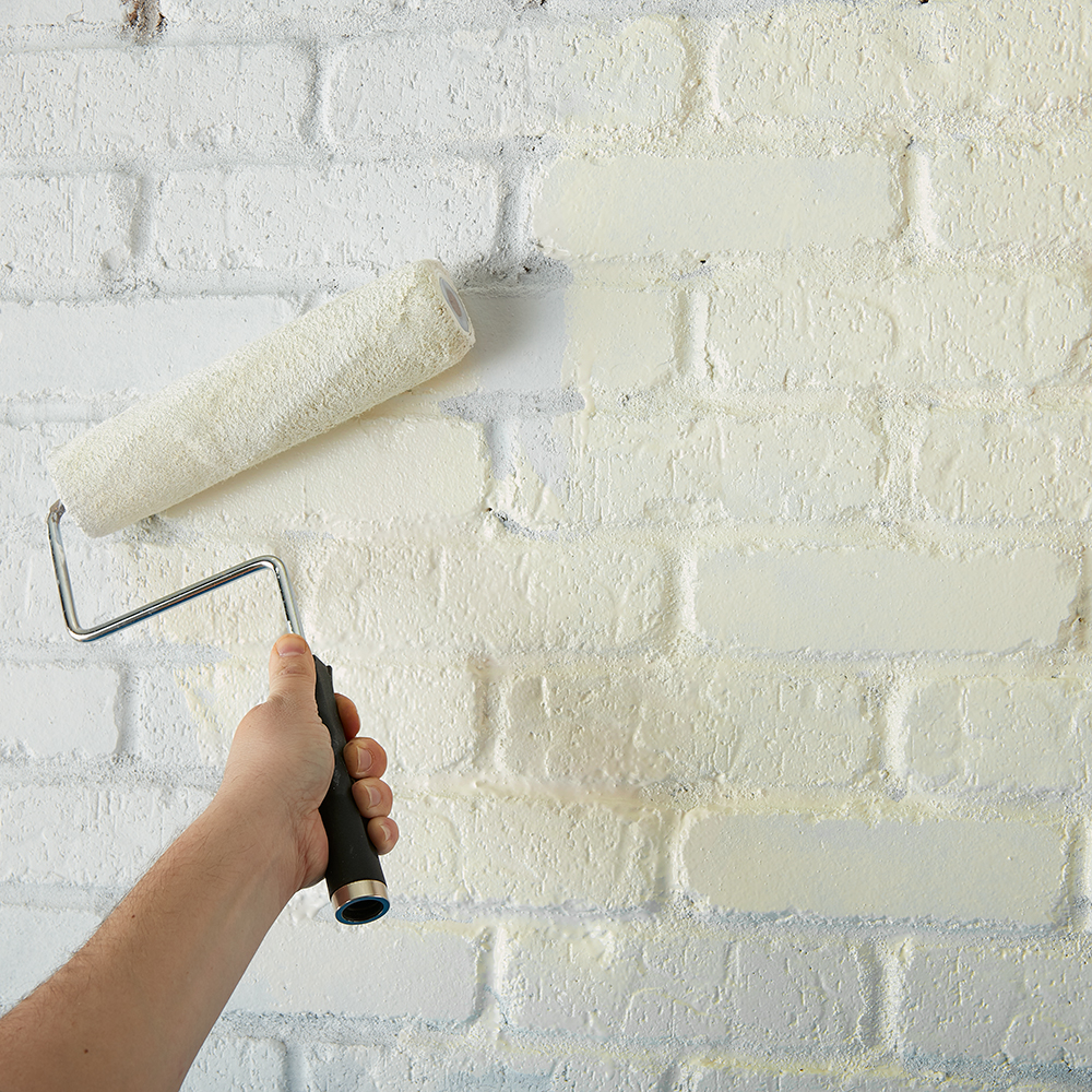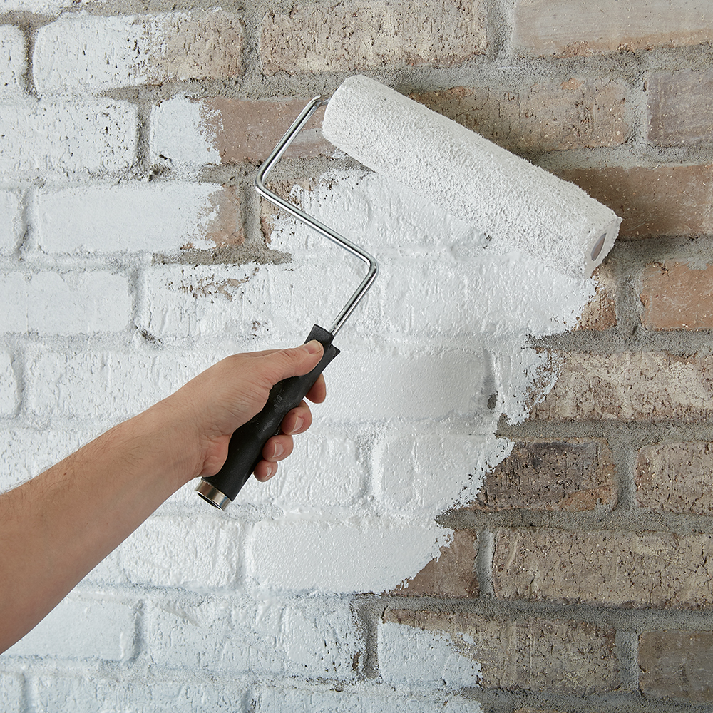 Next, use a roller to cover the brick faces with primer. If needed, go back with a small angled brush to fill in any remaining grout areas. Allow to dry.