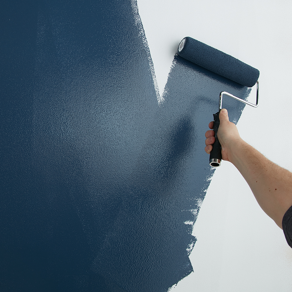 Once primer is dry, apply KILZ Tribute® in Ruling Royalty using the same application method as the primer (using a brush first to cut in around the edges 4 to 6 feet at a time, then use a roller to fill in those sections before moving along).