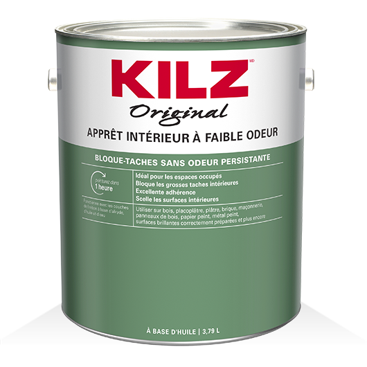 KILZMD ORIGINAL À FAIBLE ODEUR, un apprêt intérieur à base d'huile, est un bouchepores, promoteur d'adhérence et bloque-taches à plus faible odeur que les apprêts typiques à base d'huile. Il est également muni d'une technologie de dissipation rapide d'odeur résultant en une absence d'odeur persistante.‡ Idéal pour une utilisation dans les bureaux, écoles, aires de restauration, appartements et autres endroits vulnérables aux odeurs de solvant ou à des niveaux élevés d'odeurs. Utiliser l'apprêt KILZ ORIGINAL À FAIBLE ODEUR pour bloquer les taches incluant les taches d'eau, de tannin et de fumée de tabac ou de feu. Non recommandé pour les planchers.