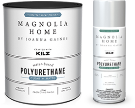 Magnolia Home by Joanna Gaines® Polyurethane clear finish provides a durable, long-lasting topcoat that allows the beauty of your newly stained interior wood surfaces to shine through. This water-based formula resists stains and scratches, protecting the desired look of your wood surfaces from day to day wear and tear. Available in two sheens: Matte and Semi-Gloss.