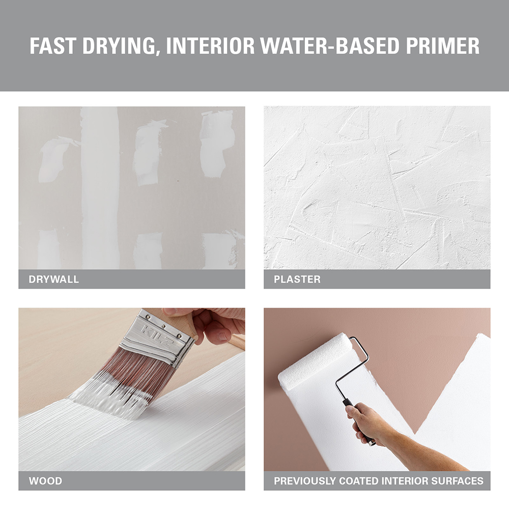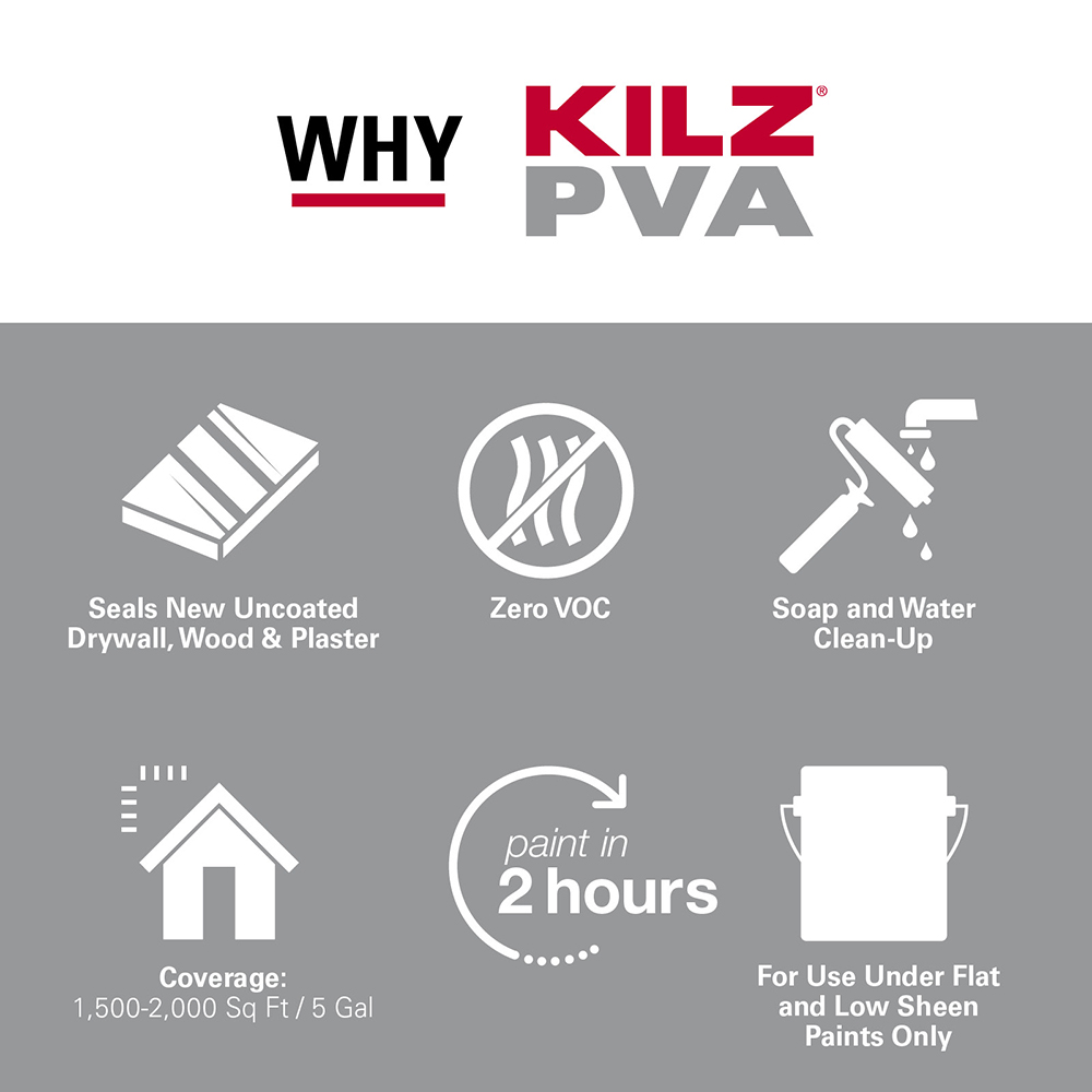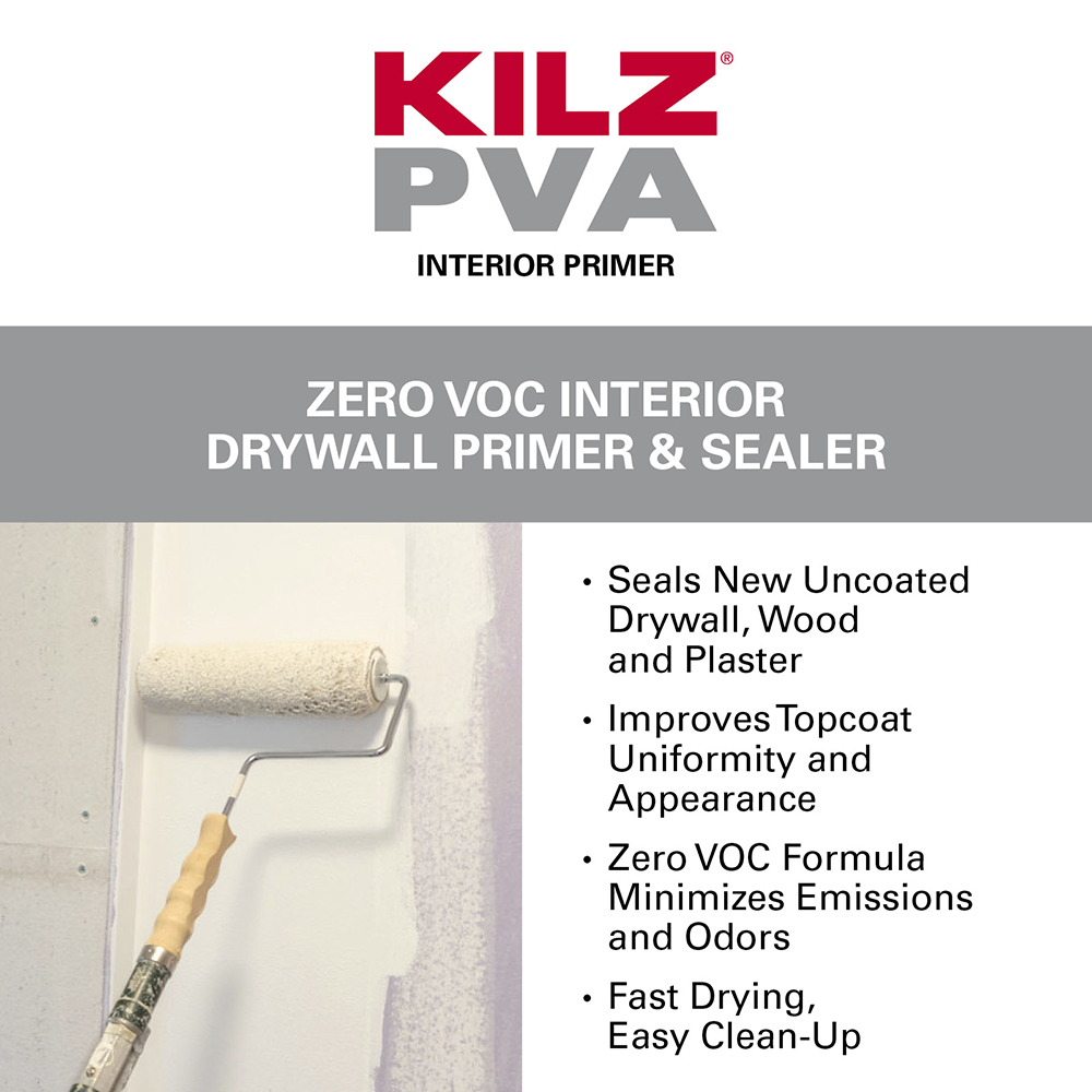 KILZ® PVA DRYWALL PRIMER is designed for use on new drywall. It can also be used on properly prepared plaster and wood as well previously coated interior surfaces. It is a fast drying, zero VOC interior water-based primer formulated to prime and seal new, uncoated drywall and other interior surfaces which can reduce the number of topcoats required to achieve a uniform, professional quality finish.