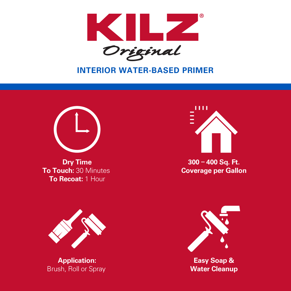 Trust KILZ Original Water-Based Primer to tackle water stains, tannin, smoke, nicotine, grease, marker and more but with significantly lower odor, low VOC’s and easy soap and water clean-up. Dries fast in 1 hour and sands easily in as little as 2 hours after application for a smooth finish.