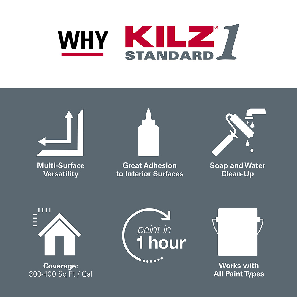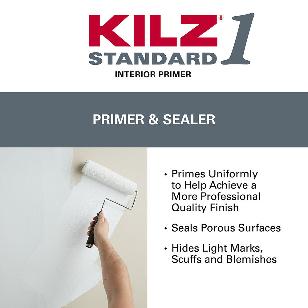 KILZ® 1 STANDARD Water-Based Primer is designed for use on multiple interior surfaces helping save cost by reducing the number of coats of paint needed to achieve optimal results. It seals porous surfaces, hides minor scuffs and marks and promotes a more uniform appearance of the topcoat. It’s ready to brush, roll or spray and can be topcoated after one hour with latex or oil-based paint.