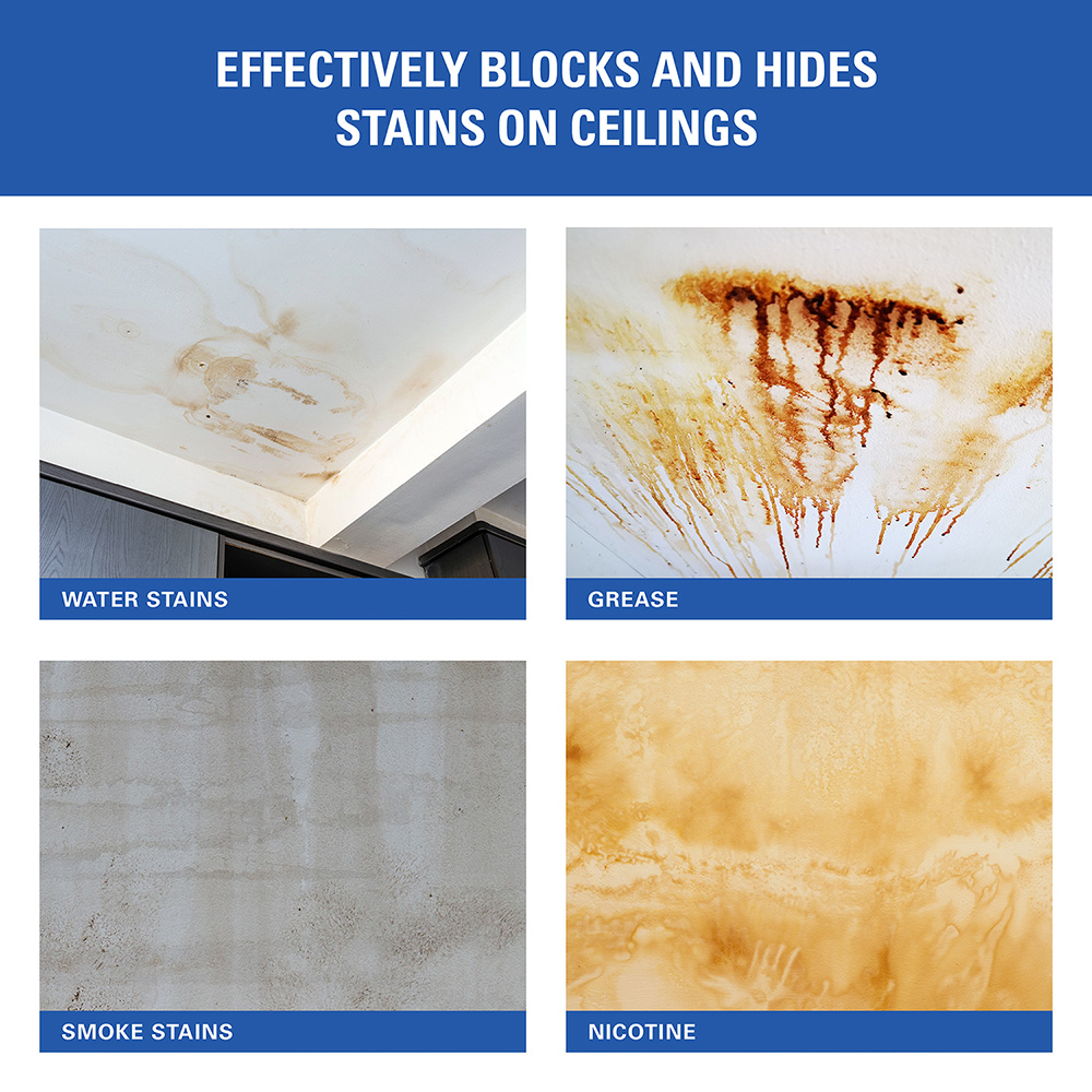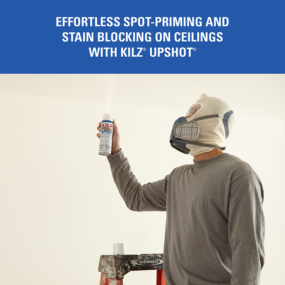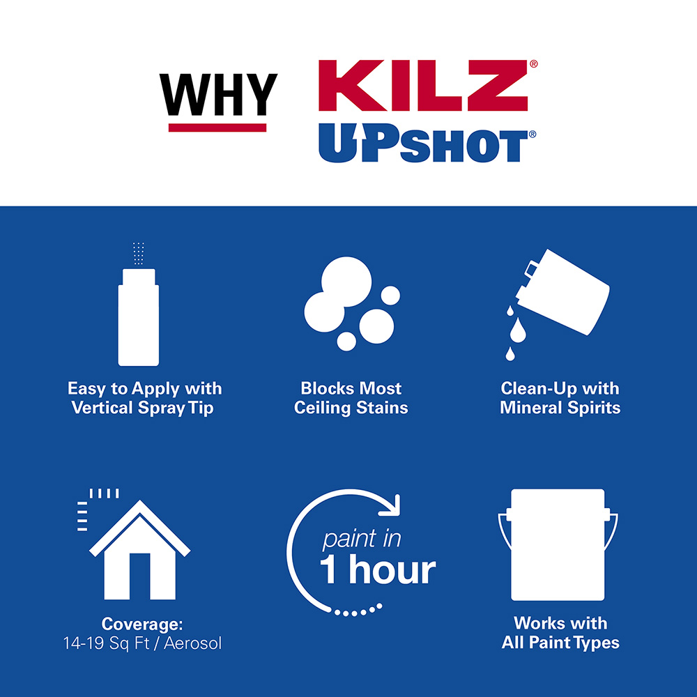 KILZ® UPSHOT® is a convenient easy to use vertical primer spray to hide and block most stains on ceilings and overhead surfaces. It can block stains caused by water, smoke, tannin, grease, nicotine and seals odors. Come with a wide comfort vertical spray tip. Use on interior surfaces including wood, drywall, plaster, paneling, wallpaper, masonry, brick, painted metal and properly prepared glossy surfaces.