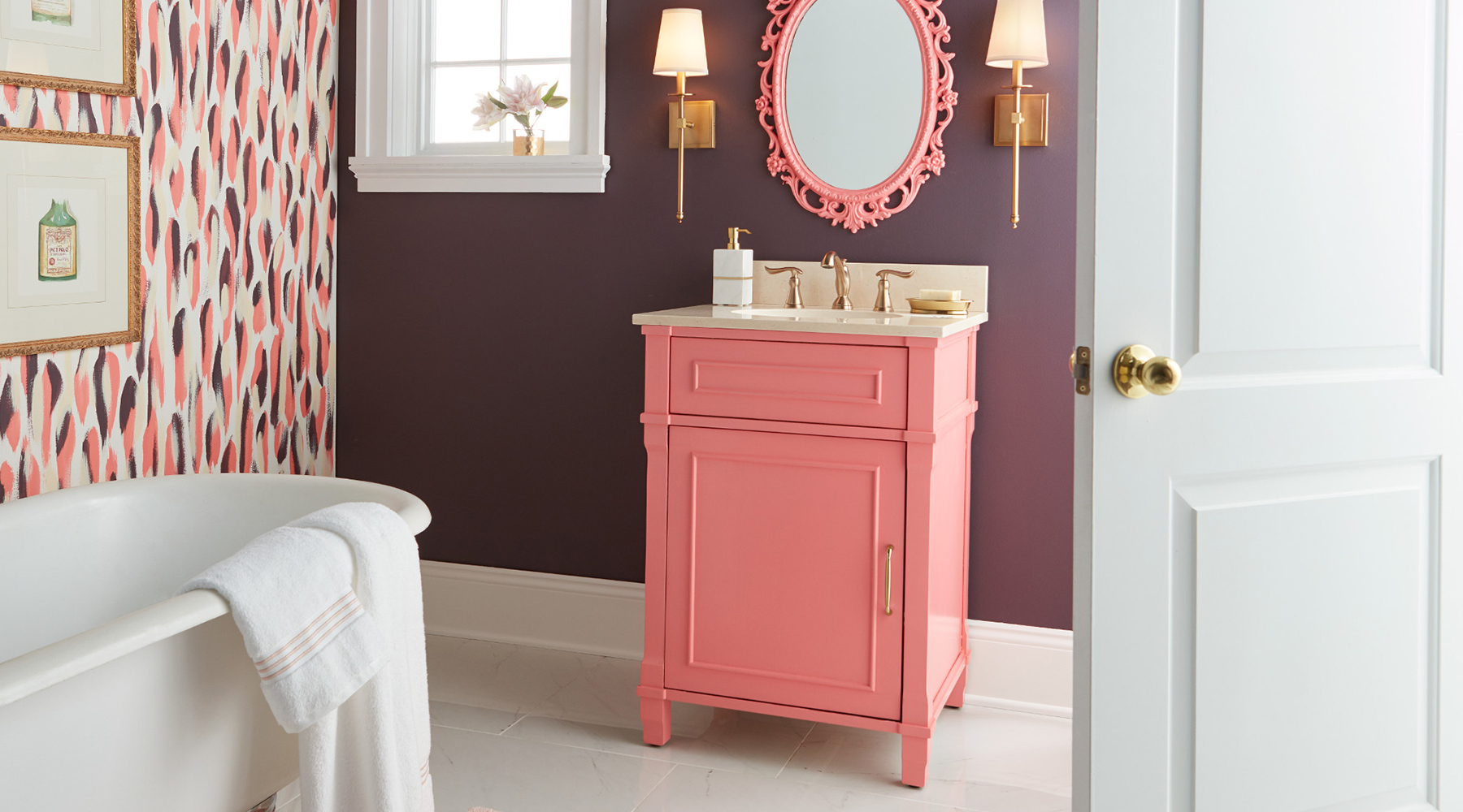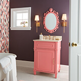 An everyday space gets a coat of unexpected flair in this stylish bathroom makeover. Priming the walls and vanity with KILZ® Kitchen & Bath ensures a mildew resistant finish that can withstand a bathroom’s typical humidity, moisture and changing temperatures. Proper priming also provides a solid anchor for paints – in this case a deep purple wall and coral-hued bath vanity. A painted “wall paper” accent wall and grapefruit-pink mirror complete the space.