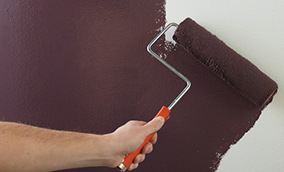 Once primer is dry, apply KILZ Complete Coat in Mulberry* RA100-02 using the same application method as the primer (using a brush first to cut in around the edges 4 to 6 feet at a time, then use a roller to fill in those sections before moving along).