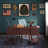 Office with cream colored walls and a floral chair Office with blue walls and military decor on the walls and on the desk