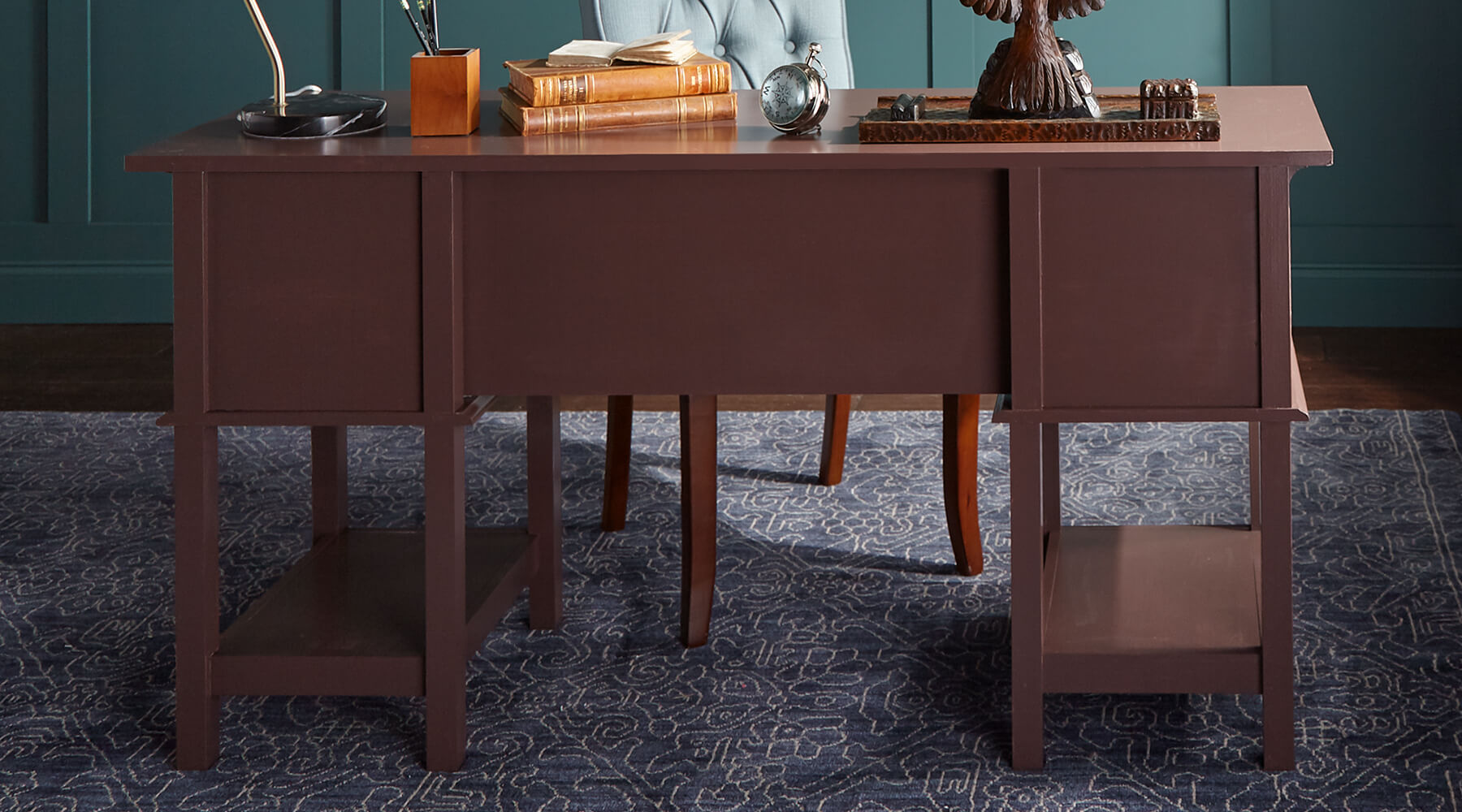 To complete this surprise room renovation, an old desk is given new life! Primed with KILZ® Original to ensure truer color from the topcoat, the desk is painted with KILZ® Tribute® in Bookmarker – a dark oxblood hue that complements the deep green walls. Want to refurbish a piece of furniture at home? Keep reading the steps below to learn how!