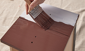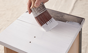 Step 5: Once primer is dry, apply KILZ® Tribute® paint in Bookmarker with a brush, moving in smooth strokes in the same direction as the wood grain.