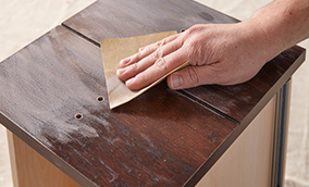 Step 2: Sand the surface; do a first pass with 100-150 grit sandpaper then finish with a second pass of 180-220 grit sandpaper.
