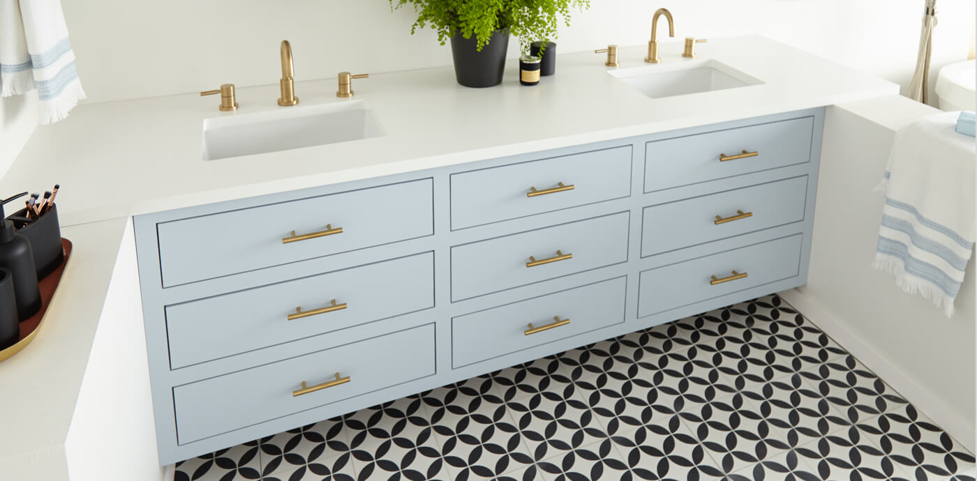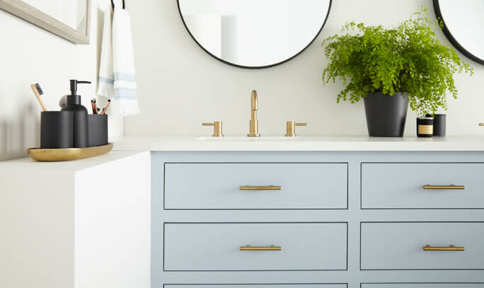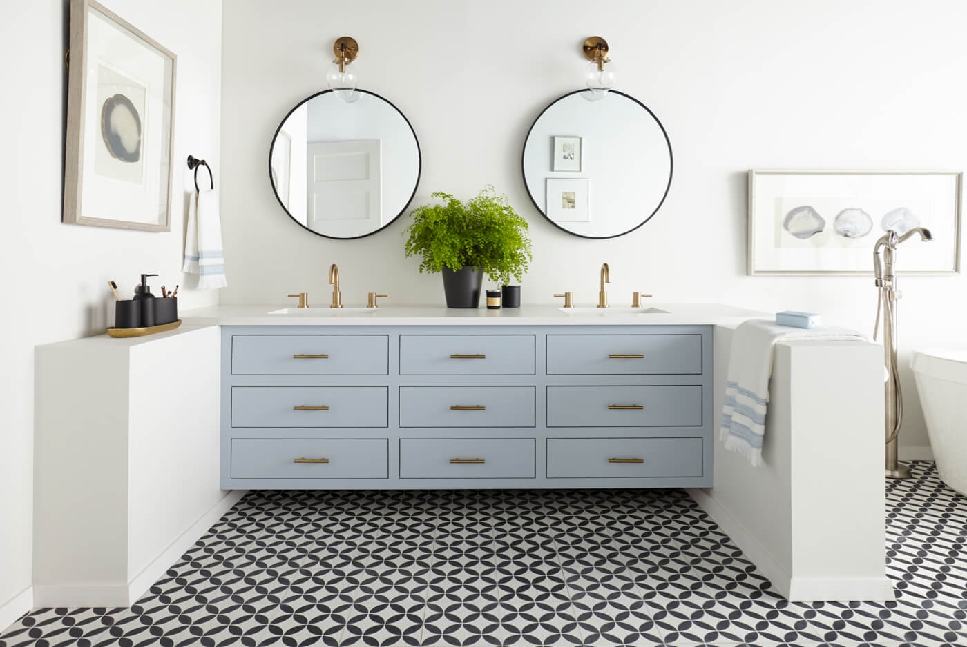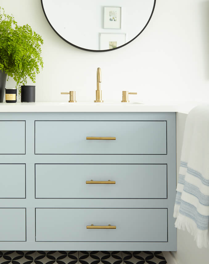 The light and bright bathroom makeover brings in a touch of contemporary flair with new brushed gold hardware and sleek circular mirrors topped with gold, globe-shaped light fixtures. And for the finishing touch, black and white tile flooring perfectly complements the new color scheme without competing – letting the beautiful blue vanity shine as the room’s focal point.