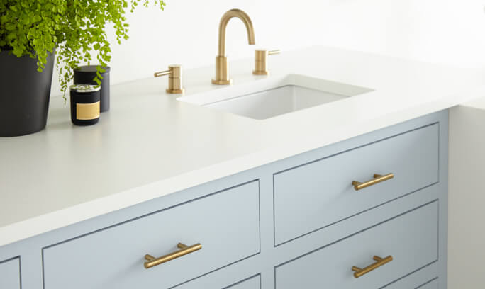 Once the primer is properly applied to the walls and vanity and allowed to dry, the bathroom is ready for paint! KILZ Tribute® in White Modern TB-09 brightens up the walls, while the same paint in Northern Sky TB-42 adds an airiness to the substantially sized vanity. KILZ Tribute provides a durable, highly scrubbable finish that resists staining, fading and peeling, ideal for DIY painting in bathrooms and beyond!
