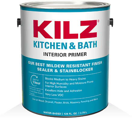 A water-based primer-sealer-stainblocker specially designed for residential surfaces in high humidity, moisture and temperature environments, KILZ® Kitchen & Bath Primer ensures a mildew resistant primer coat, essential for almost any bathroom renovation. It also offers excellent adhesion to most interior surfaces and provides a sound anchor for paints.