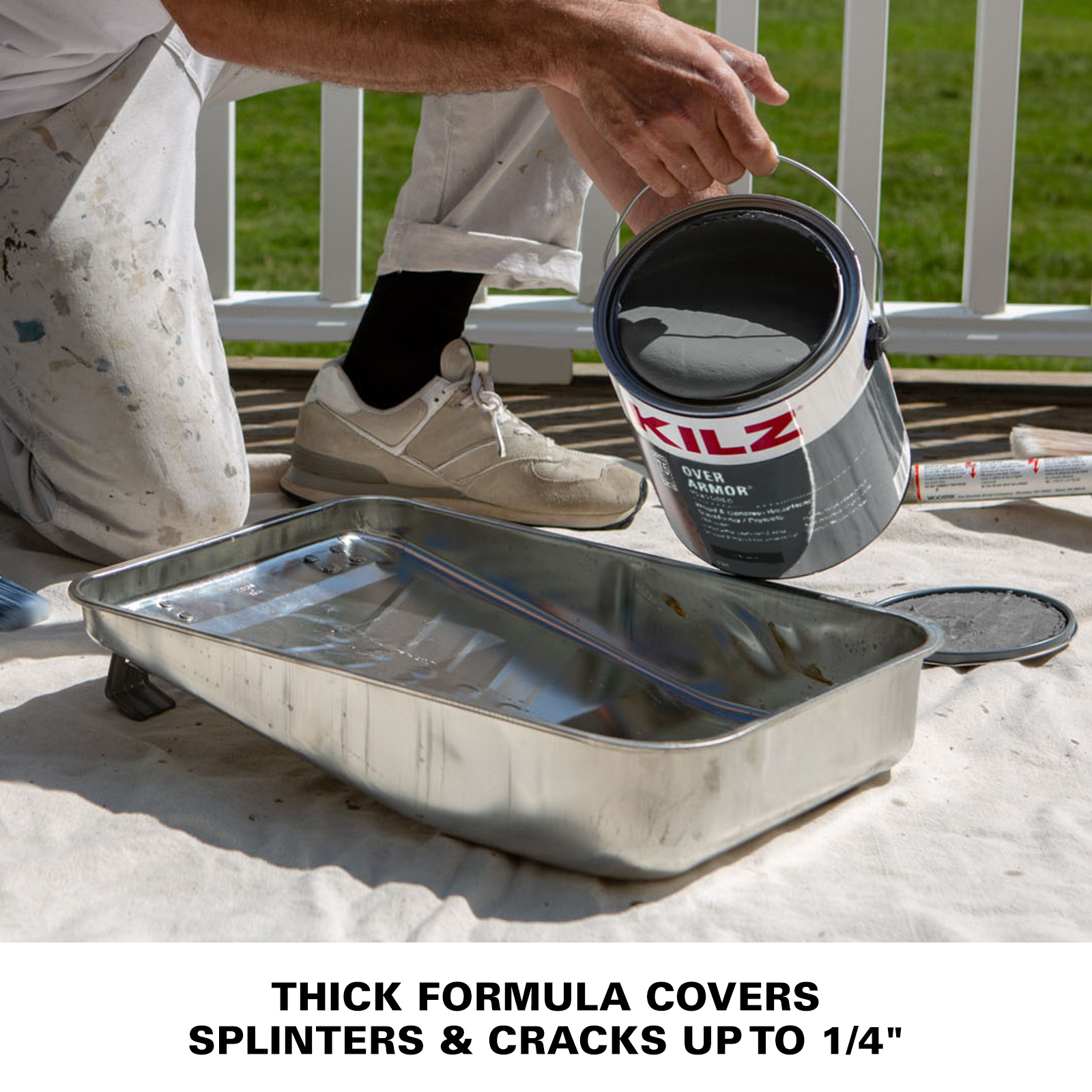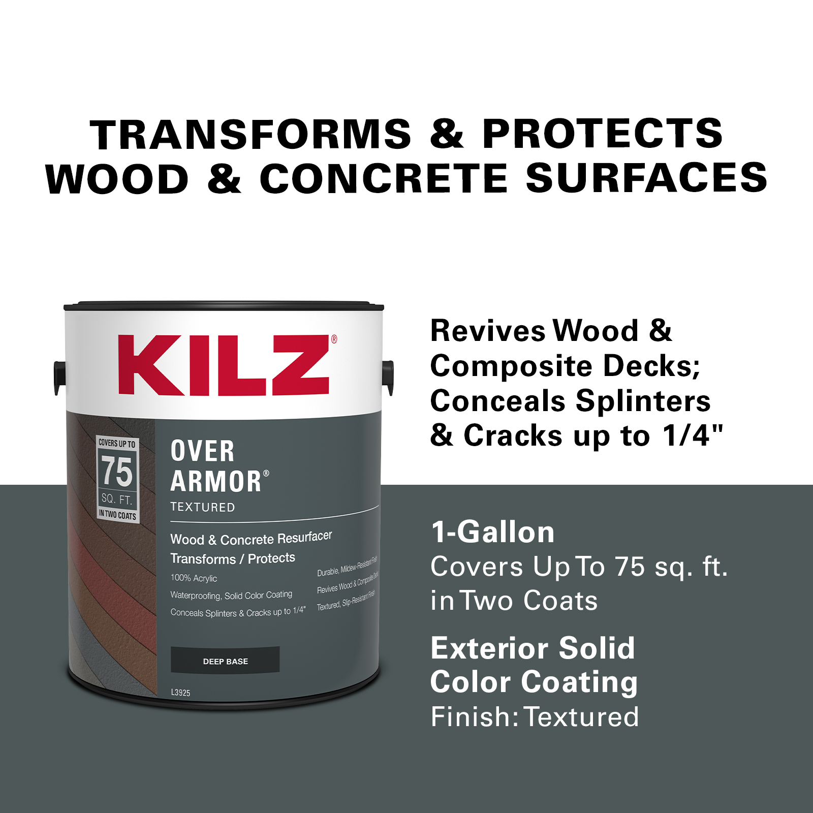 Where To BuyKILZ OVER ARMOR Textured Solid Color Coating is an innovative, waterproofing solid color coating that will bring your old, weathered wood or concrete back to life. The advanced 100% acrylic resin creates a durable coating on your tired deck, rejuvenating its look. KILZ OVER ARMOR Textured Solid Color Coating is designed to conceal splinters & cracks up to 1/4" and creates a textured, slip-resistant finish. It is available in a selection of popular wood and concrete custom colors.