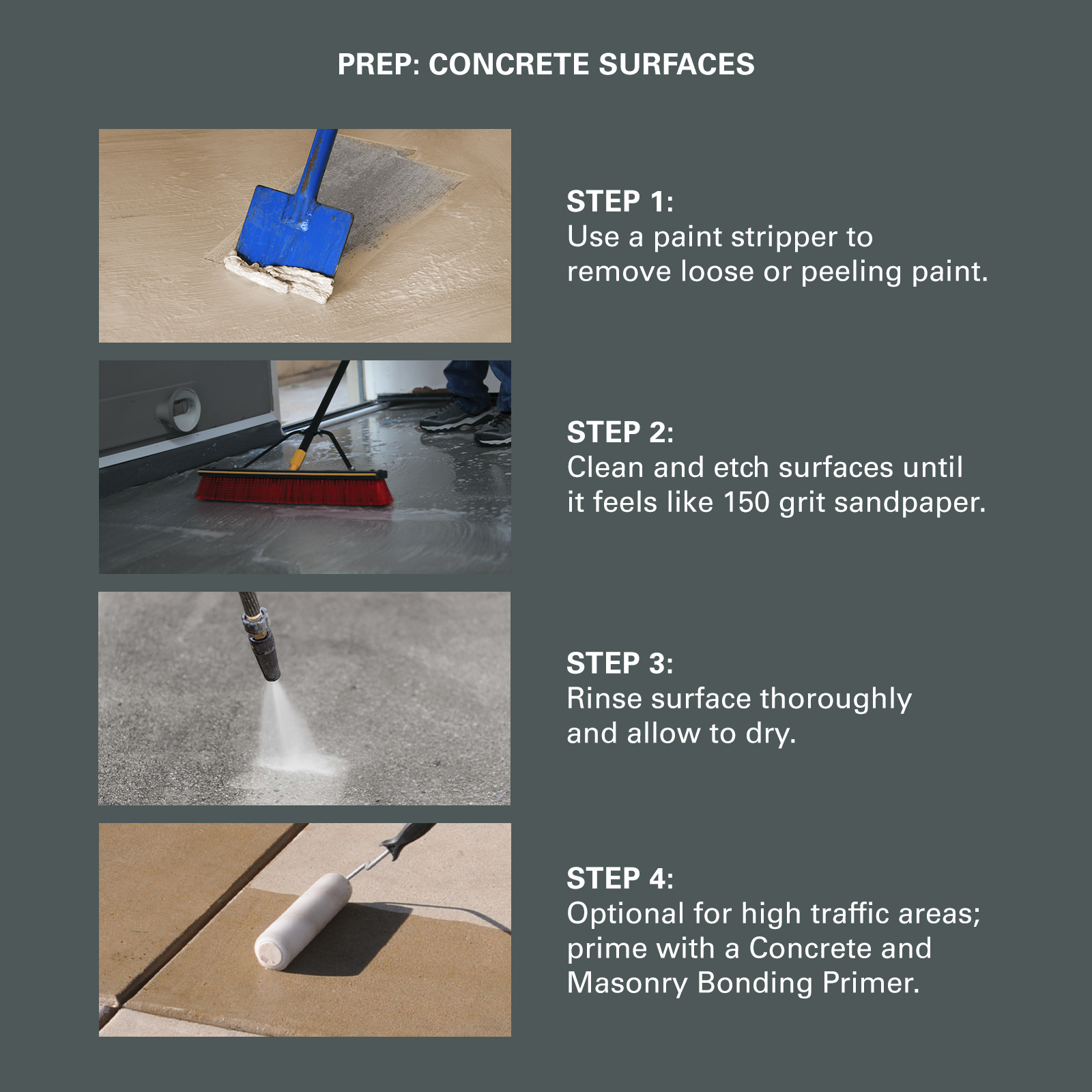 - Use a concrete & masonry cleaner & etcher to clean and etch uncoated concrete to achieve a textured profile similar to 150 grit sandpaper or a concrete & masonry degreaser & cleaner.