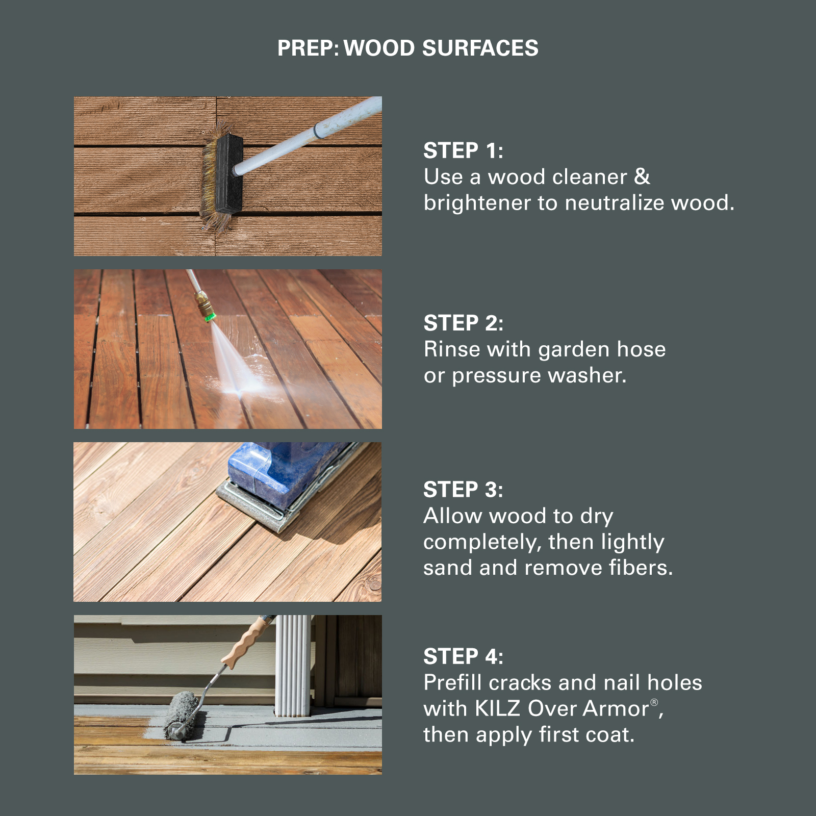 - Use a wood stain & finish stripper to remove all loose wood fibers, peeling paint/stain or deteriorated coatings prior to application of KILZ OVER ARMOR Textured Solid Color Coating (must be followed by a wood cleaner & brightener afterwards to neutralize).